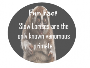 A venomous animal is one that bite or sting to inject their venom (a poisonous substance). Venomous animals use venomous bite or sting only when they are in danger and to protect themselves from harm or to hunt their prey. Some animals are deadly venomous – King Cobras, Blue-Ringed Octopus, Box Jellyfish. Other animals are not venomous enough to kill humans but can take down smaller prey and used when attacked – Just like our little furry friend, the slow loris.